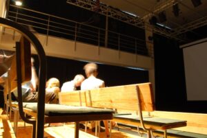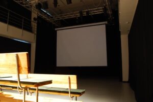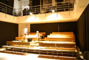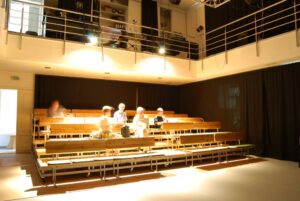 - Третій та мансардний поверхи цілком віддані театралам – тут розміщена комфортабельна театральна лабораторія з технічним балконом максимально наближена до справжньої театральної зали. Вона забезпечена чоловічою та жіночою гримерними кімнатами і сан. вузлом з душовою кабінкою. Також на цих поверхах є дві менш комфортні репетиційні зали та кімнати для зберігання театральних атрибутів. Театральна лабораторія та репетиційні зали забезпечуються підвісною решіткою, виконаною з металевих труб діаметром 25 мм, для монтажу освітлювального та іншого обладнання.