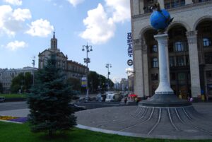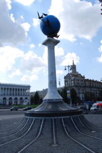 2 варіант – в зв’язку з реконструкцією Майдану в 2001-2002 рр., та переносом скульптурного зображення Архістратига Михайла на капличку над Лядськими воротами, відновлення монументального знаку Поштовий центр України стало можливим з новим знаком-завершенням на колонні – Глобусом з 5 поштовими голубами.